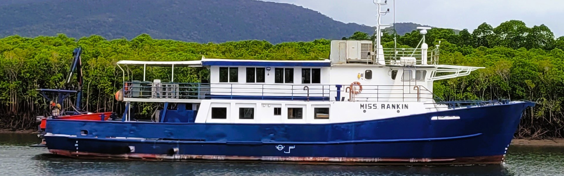 Cairns-based MV Miss Rankin is ideal for a range of research charter boat requirements. Owner and skipper Tony Collins has completed many successful research charters, which include but are not limited to, bathymetric survey, hydrographic survey, sampling to 3,000m, sediment trap deployment and recovery, and plankton net deployment. The boat has 3-phase 415 volt power for operating large machinery, and a 11 CFM compressor on board.